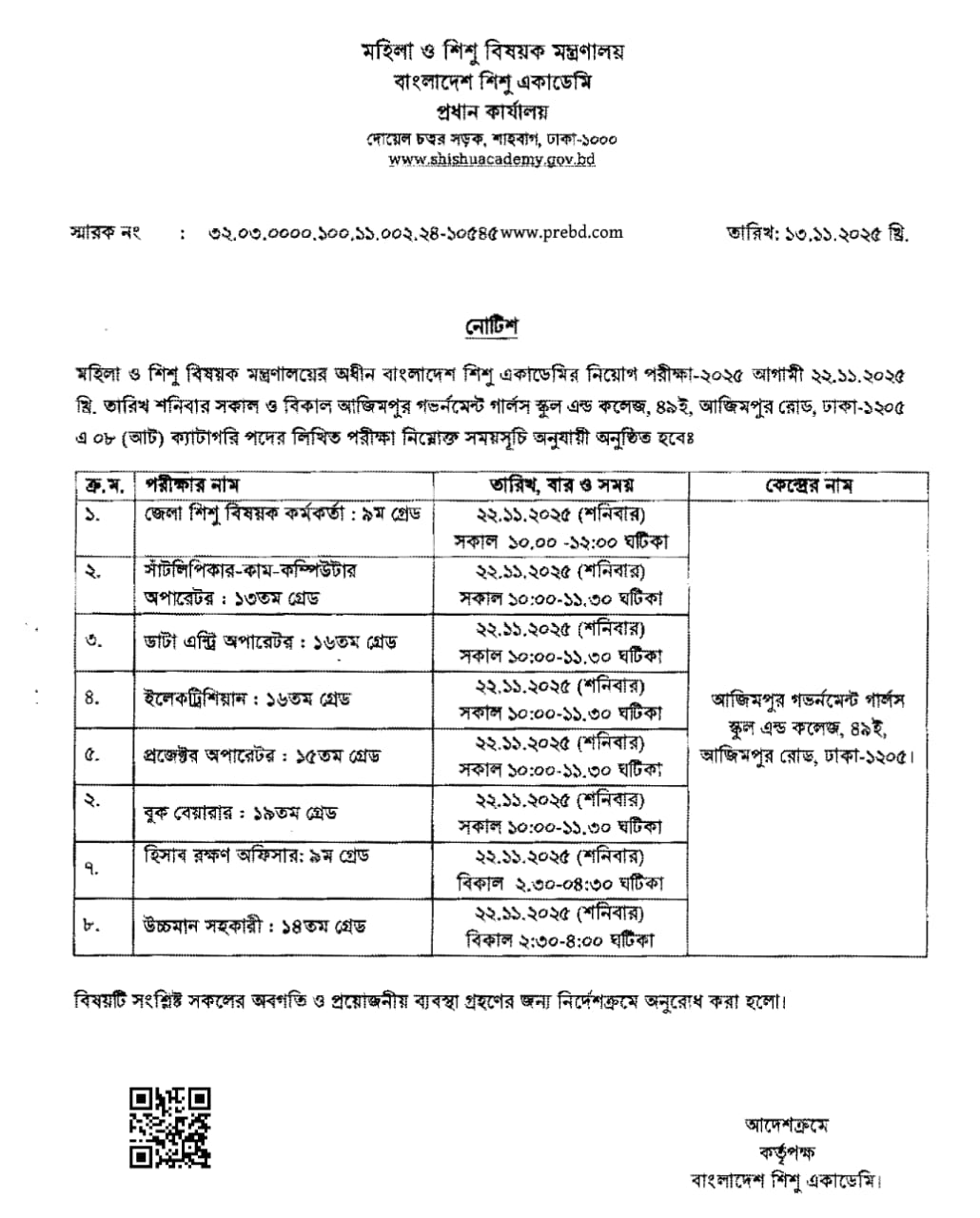 বাংলাদেশ শিশু একাডেমির বিভিন্ন পদের নিয়োগ পরীক্ষার সময়সূচী
